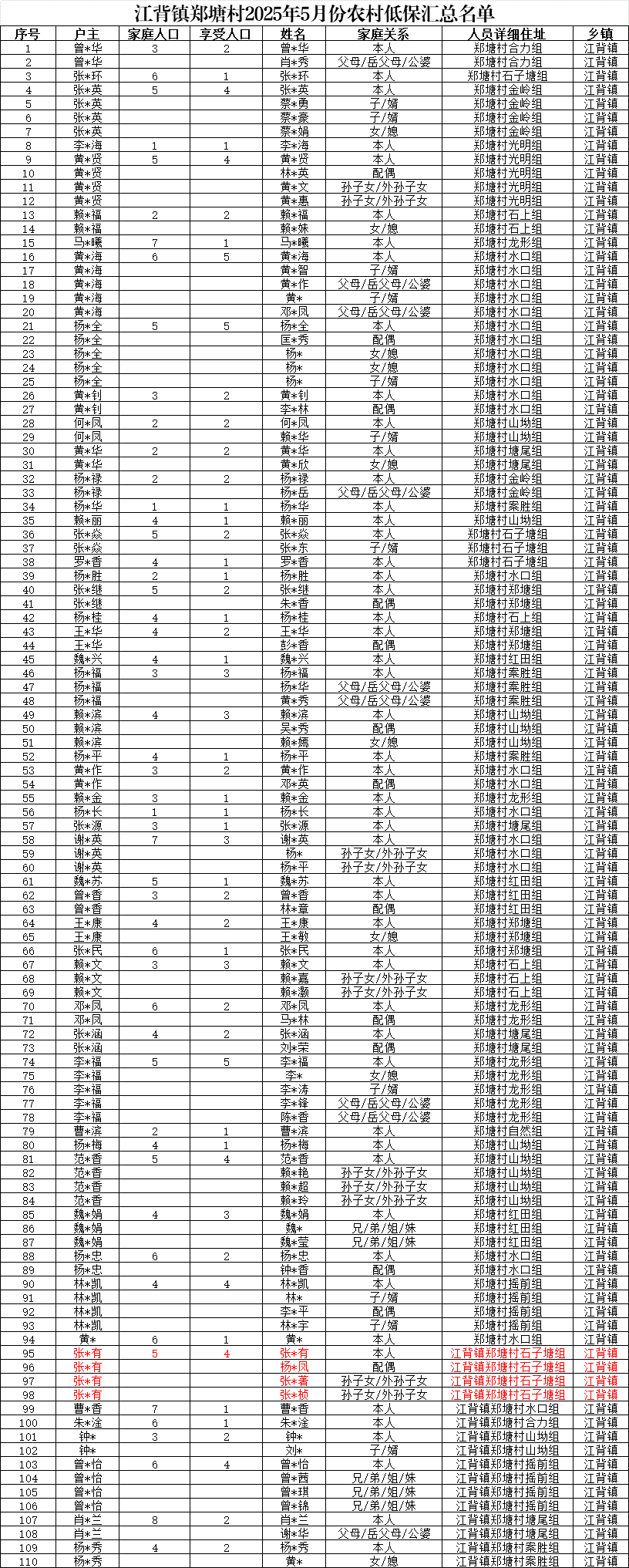 【社會(huì)救助】江背鎮(zhèn)鄭塘村2025年5月份農(nóng)村低保匯總名單