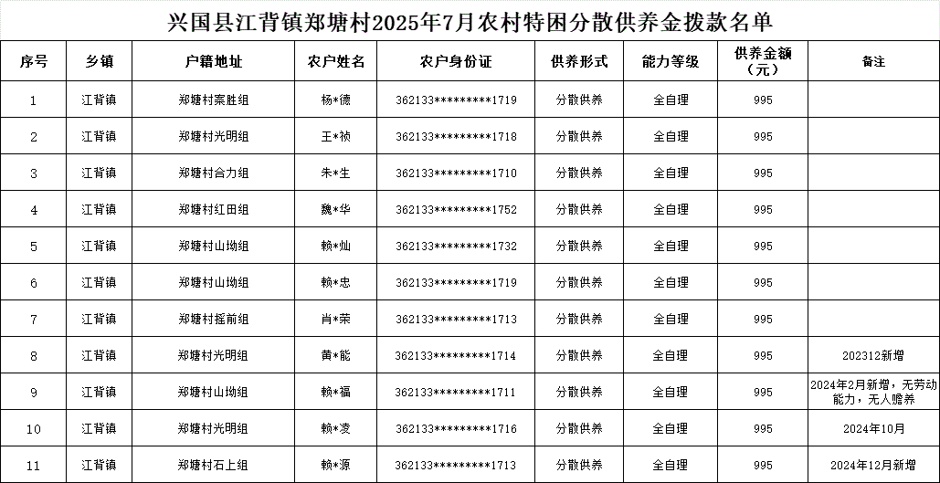 【社會救助】興國縣江背鎮鄭塘村2025年7月農村特困分散供養金撥款名單