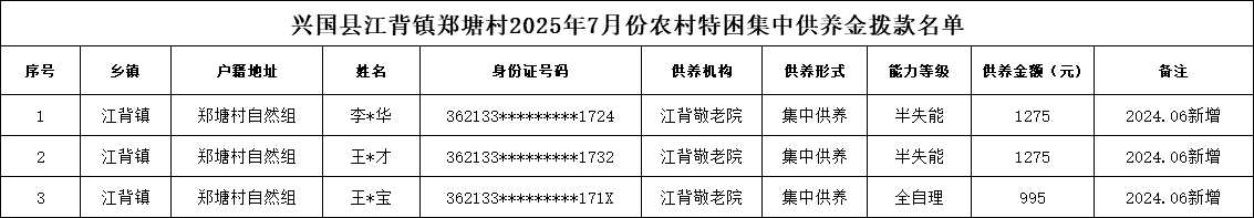 【社會救助】興國縣江背鎮鄭塘村2025年7月份農村特困集中供養金撥款名單