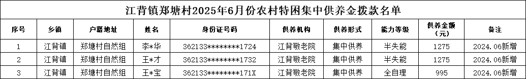 【社會(huì)救助】江背鎮(zhèn)鄭塘村2025年6月份農(nóng)村特困集中供養(yǎng)金撥款名單