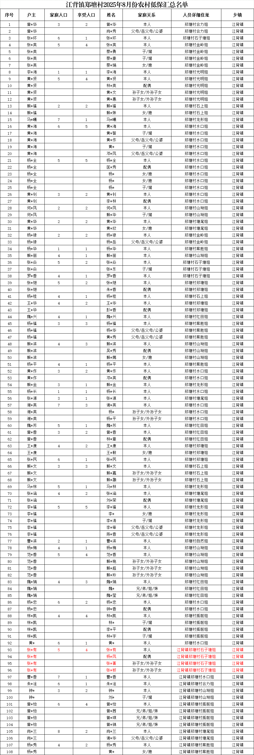 【社會救助】江背鎮鄭塘村2025年8月份農村低保匯總名單