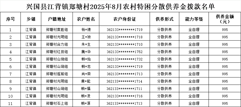 【社會(huì)救助】江背鎮(zhèn)鄭塘村2025年8月農(nóng)村特困分散供養(yǎng)金撥款名單