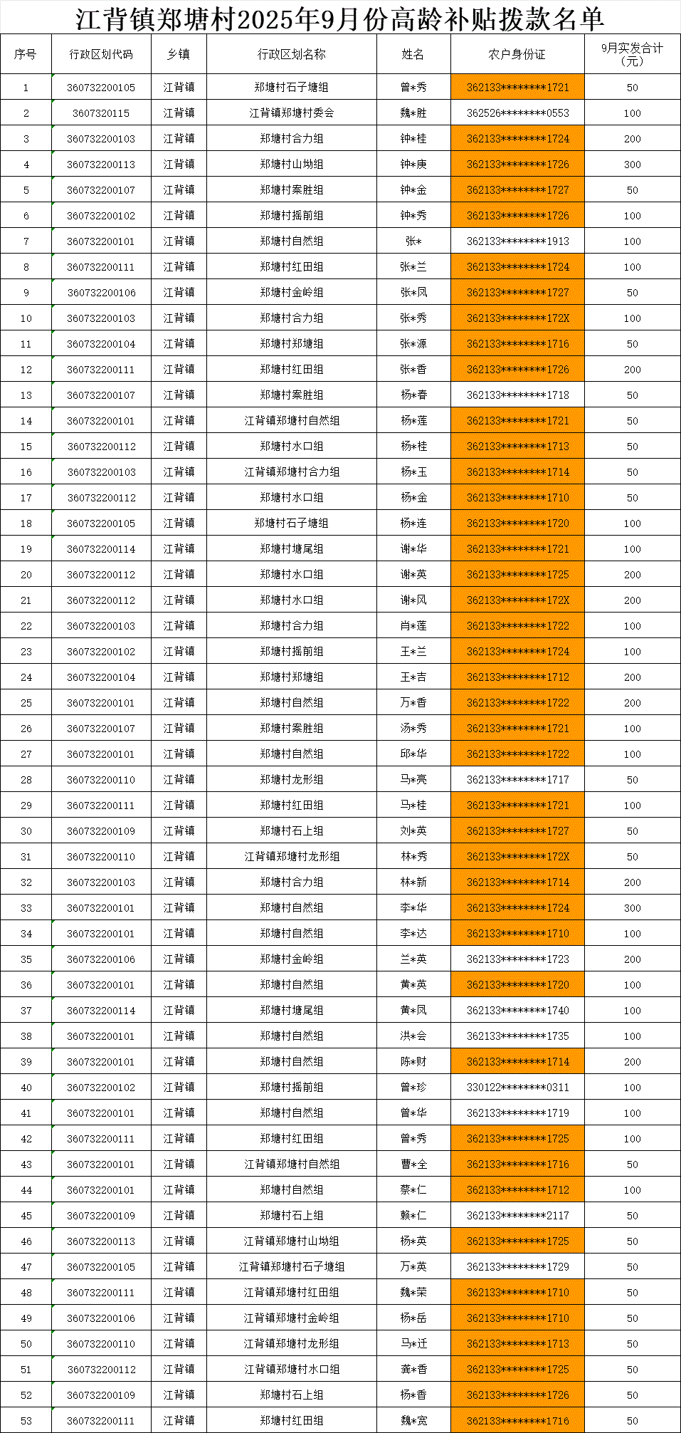 【養老服務】江背鎮鄭塘村2025年9月份高齡補貼撥款名單