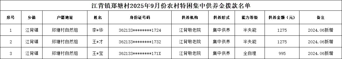 【社會救助】江背鎮鄭塘村2025年9月份農村特困集中供養金撥款名單