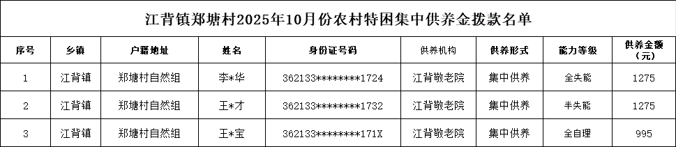 【社會救助】江背鎮鄭塘村2025年10月份農村特困集中供養金撥款名單