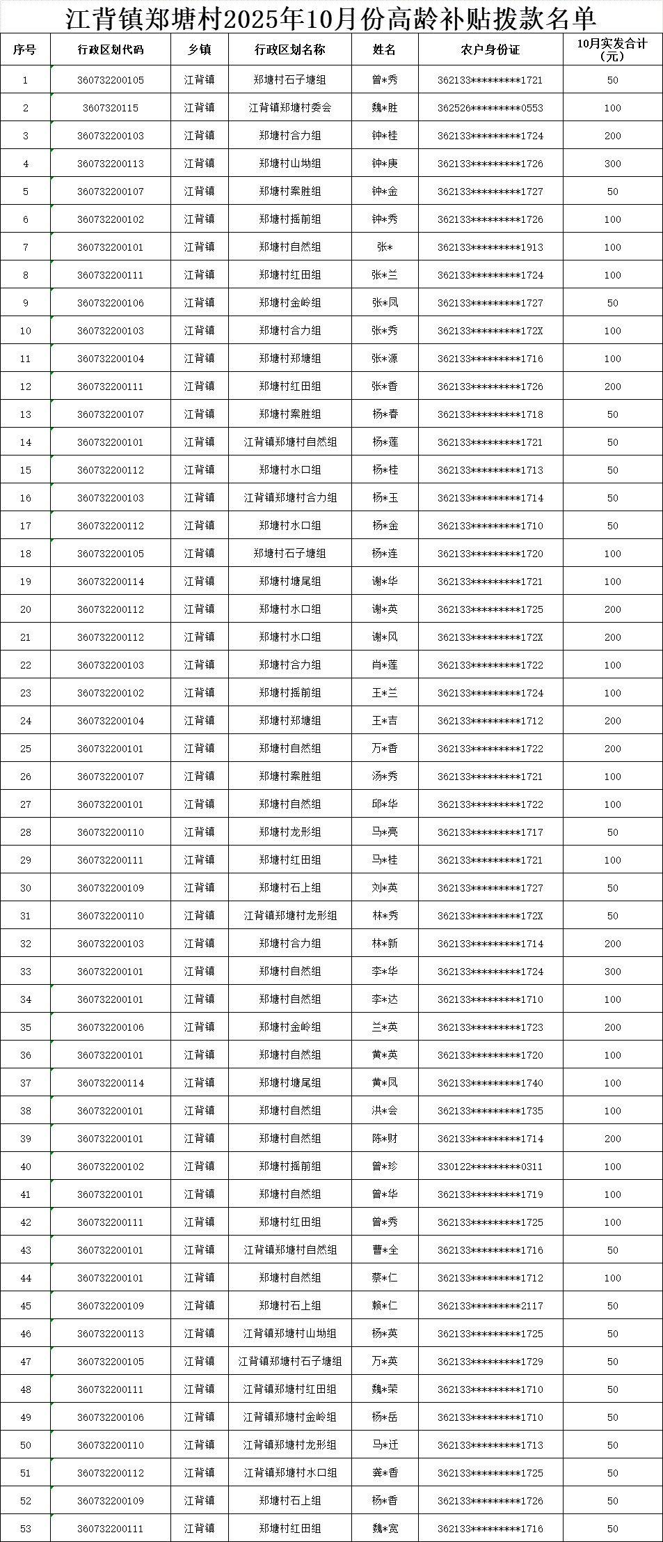 【養(yǎng)老服務(wù)】江背鎮(zhèn)鄭塘村2025年10月份高齡補(bǔ)貼撥款名單