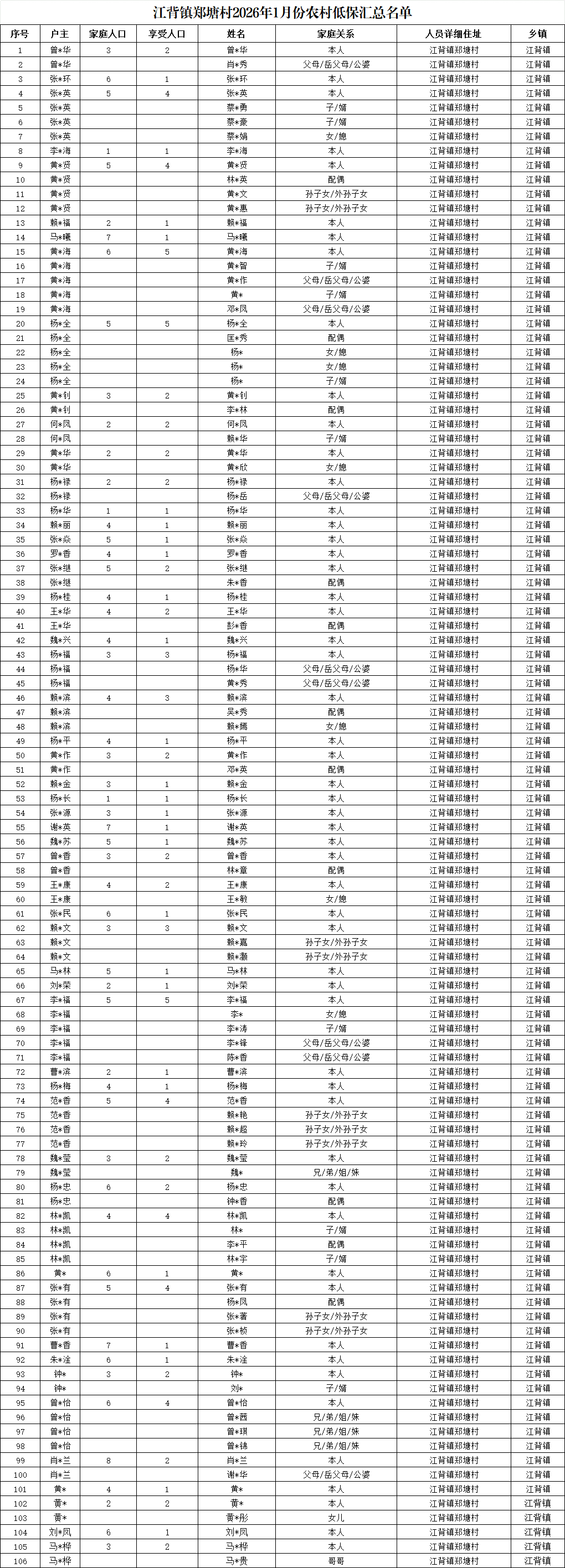 【社會救助】江背鎮鄭塘村2026年1月份農村低保匯總名單