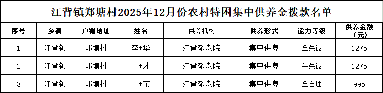 【社會救助】江背鎮鄭塘村2025年12月份農村特困集中供養金撥款名單