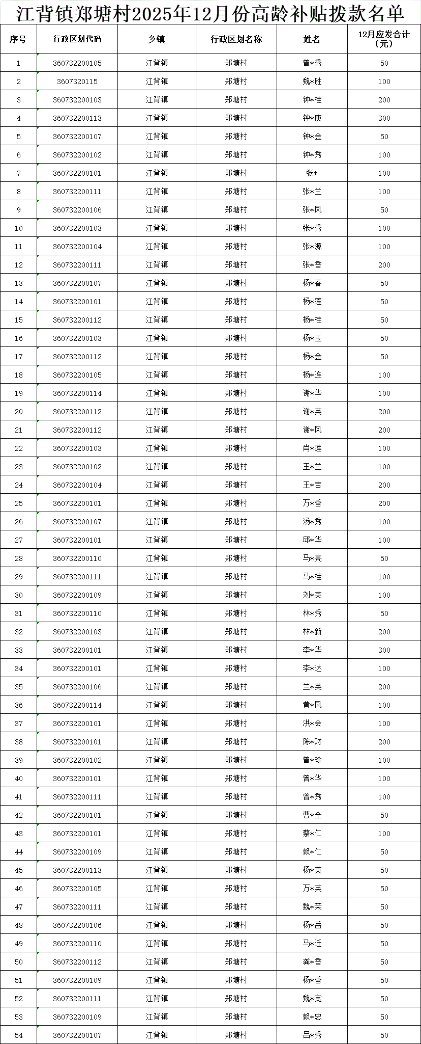 【養老服務】江背鎮鄭塘村2025年12月份高齡補貼撥款名單