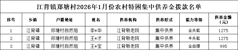 【社會(huì)救助】江背鎮(zhèn)鄭塘村2026年1月份農(nóng)村特困集中供養(yǎng)金撥款名單