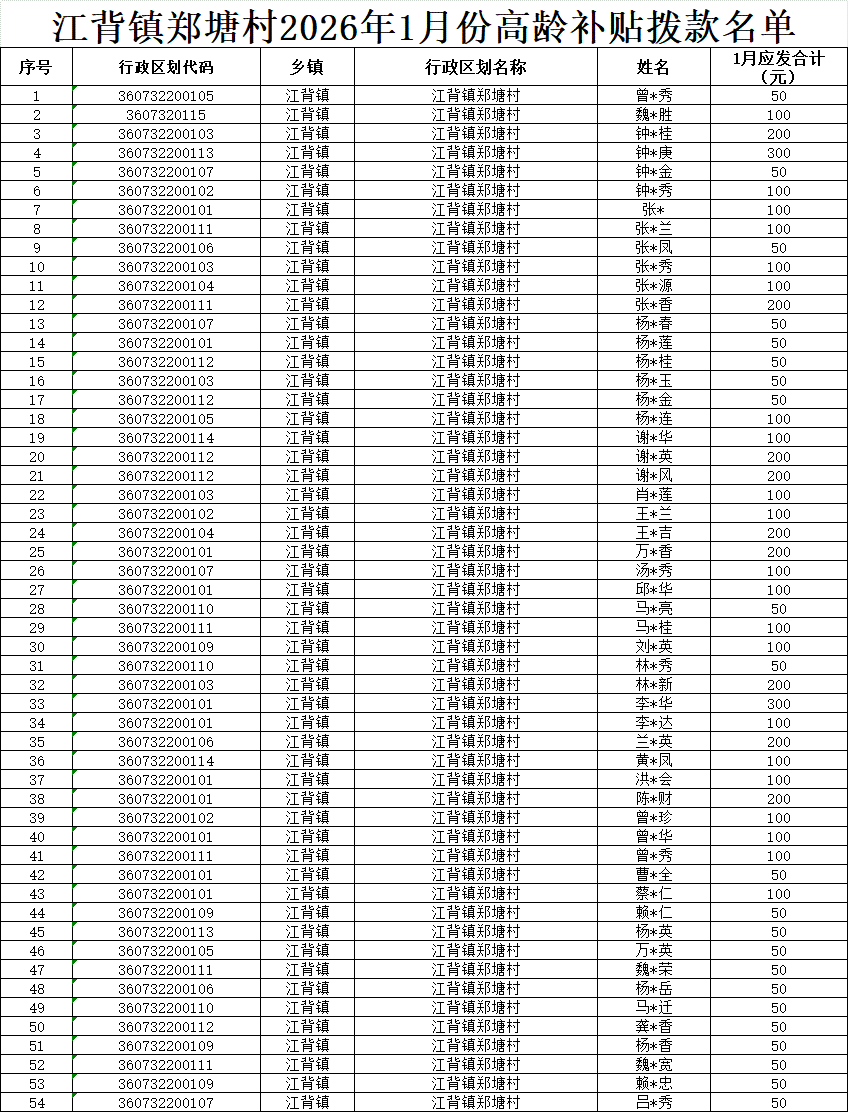 【養(yǎng)老服務(wù)】江背鎮(zhèn)鄭塘村2026年1月份高齡補(bǔ)貼撥款名單