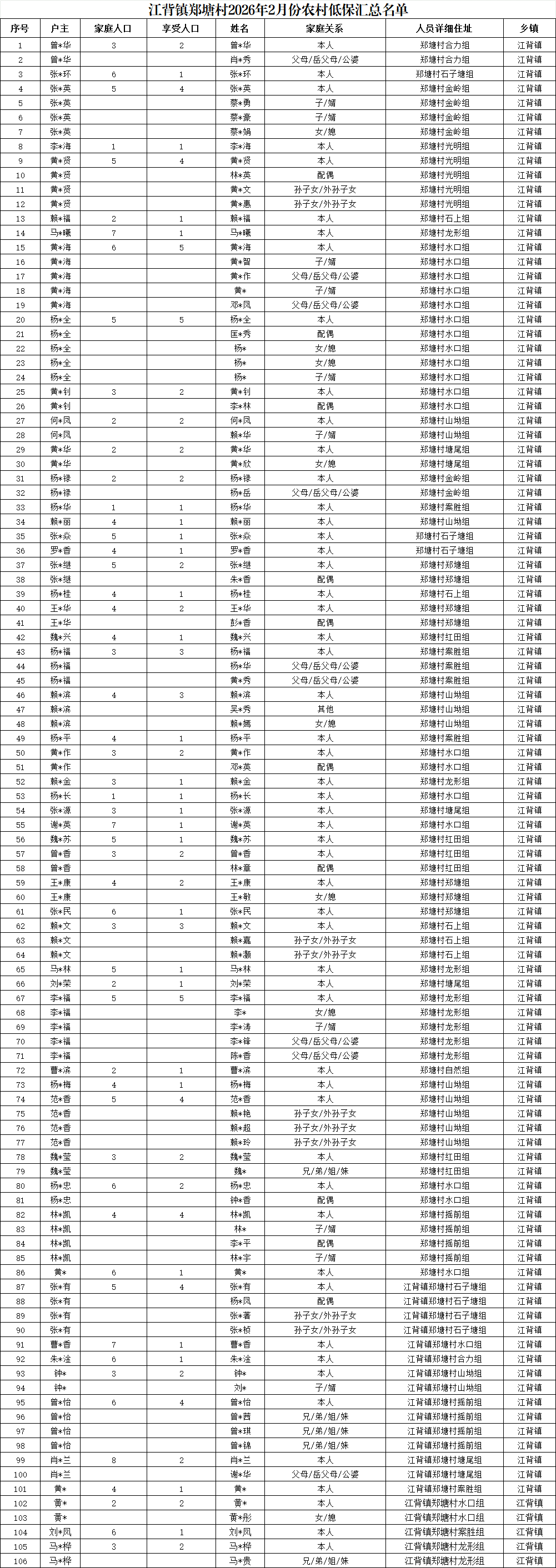 【社會(huì)救助】江背鎮(zhèn)鄭塘村2026年2月份農(nóng)村低保匯總名單