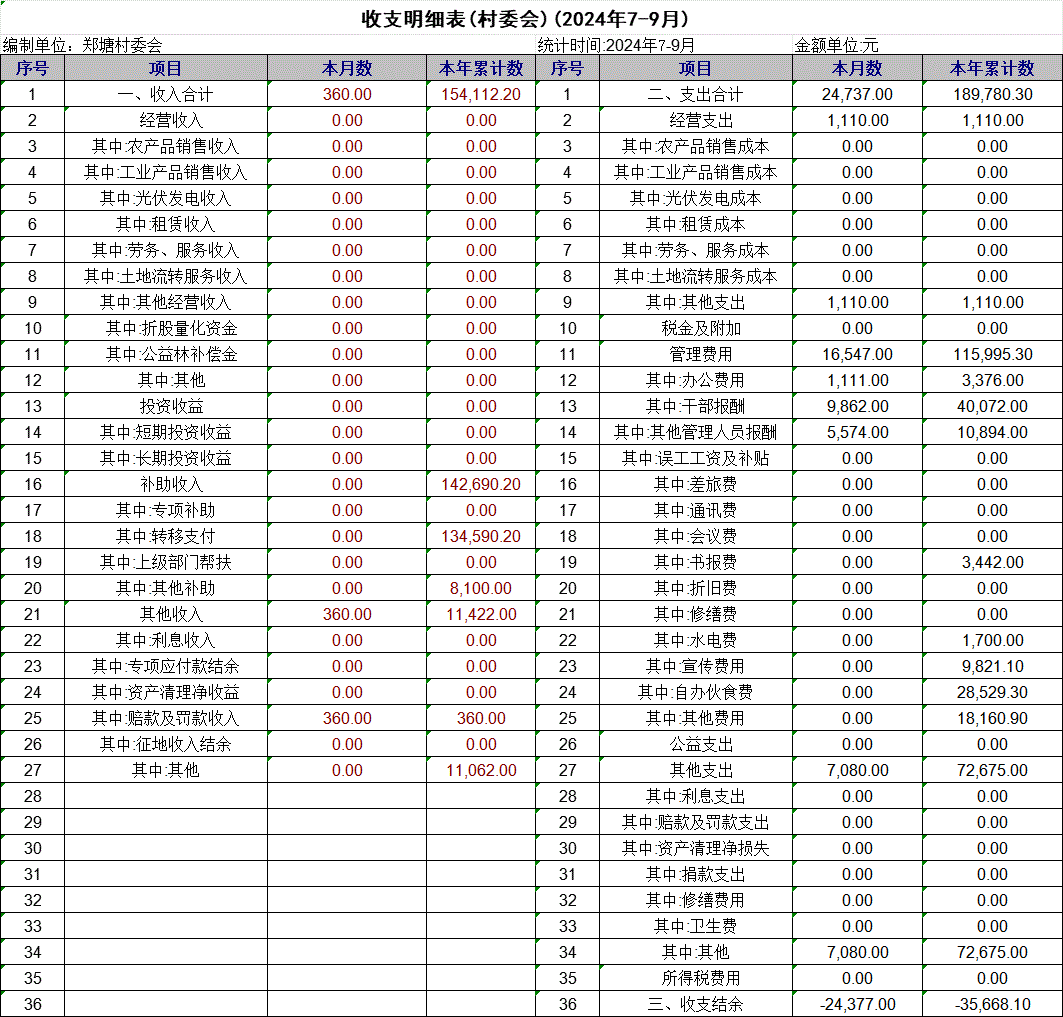 【財(cái)務(wù)收支】鄭塘村2024年第三季度收支明細(xì)表公示