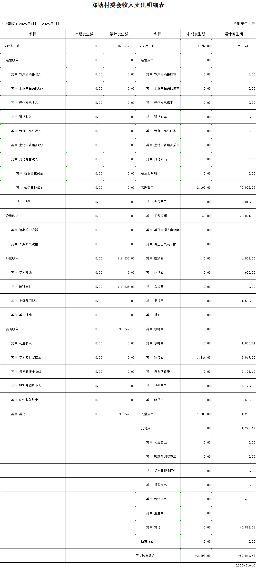 【財務收支】鄭塘村2025年第一季度收支明細表公示
