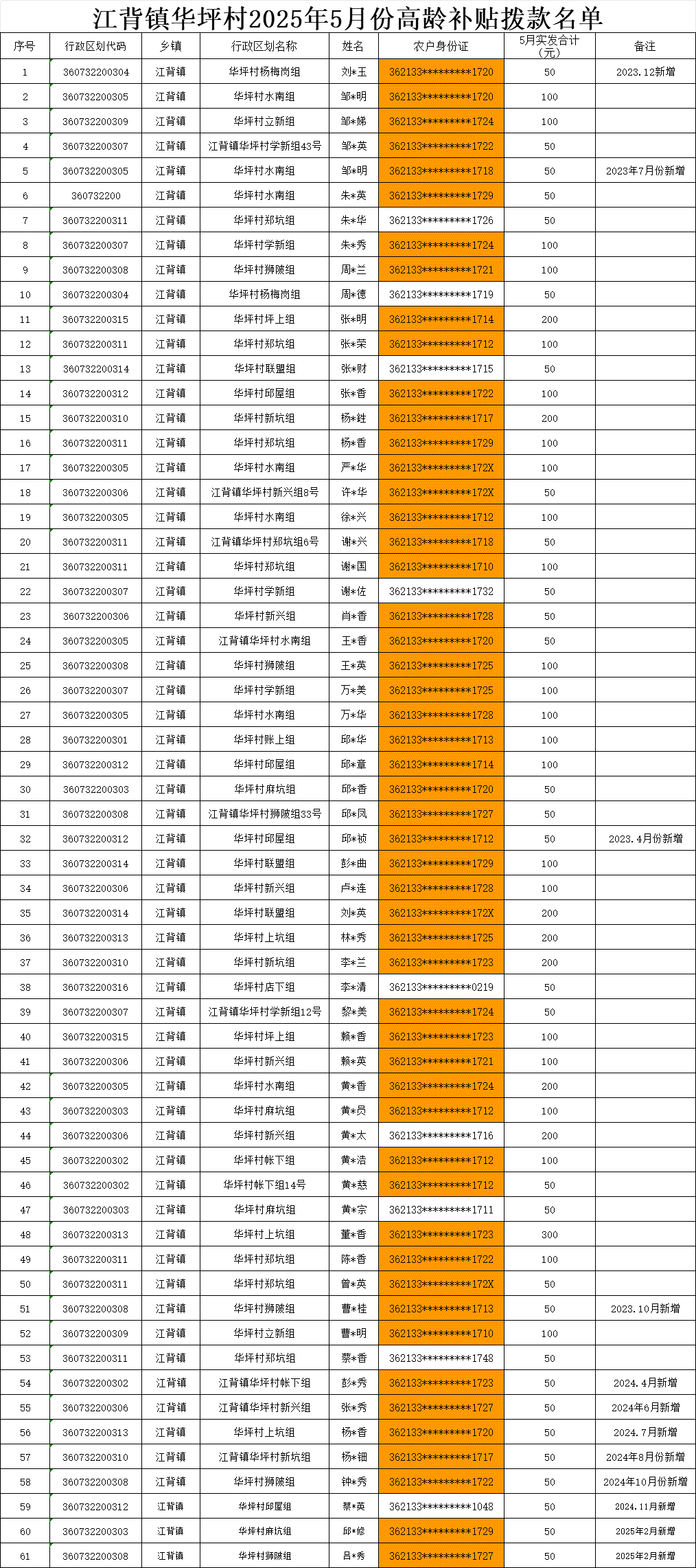 【養老服務】江背鎮華坪村2025年5月份高齡補貼撥款名單