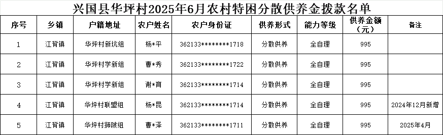 【社會救助】興國縣華坪村2025年6月農(nóng)村特困分散供養(yǎng)金撥款名單