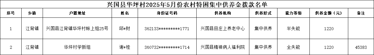 【社會救助】興國縣華坪村2025年5月份農村特困集中供養金撥款名單