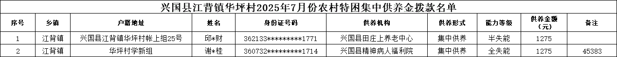 【社會救助】興國縣江背鎮華坪村2025年7月份農村特困集中供養金撥款名單