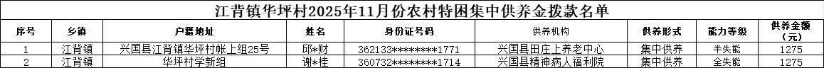 【社會救助】江背鎮(zhèn)華坪村2025年11月份農(nóng)村特困集中供養(yǎng)金撥款名單