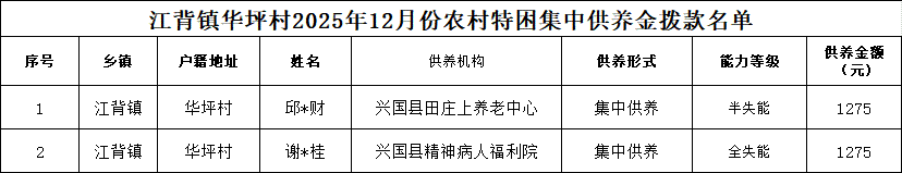 【社會救助】江背鎮華坪村2025年12月份農村特困集中供養金撥款名單