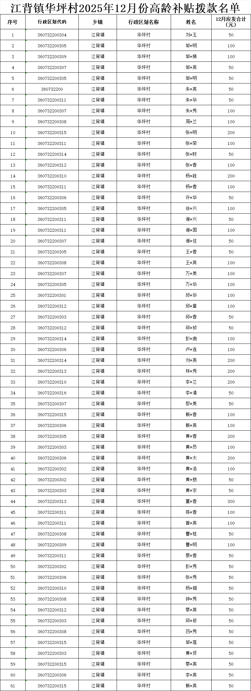 【養老服務】江背鎮華坪村2025年12月份高齡補貼撥款名單
