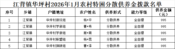 【社會(huì)救助】江背鎮(zhèn)華坪村2026年1月農(nóng)村特困分散供養(yǎng)金撥款名單