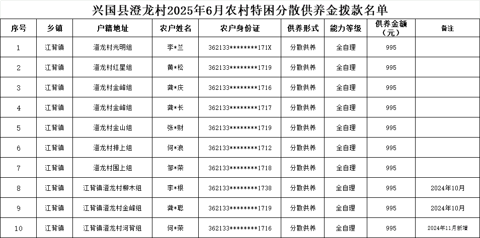 【社會救助】興國縣澄龍村2025年6月農村特困分散供養金撥款名單