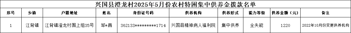【社會(huì)救助】興國(guó)縣澄龍村2025年5月份農(nóng)村特困集中供養(yǎng)金撥款名單
