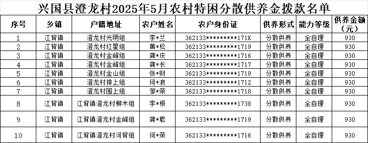 【社會救助】興國縣澄龍村2025年5月農(nóng)村特困分散供養(yǎng)金撥款名單