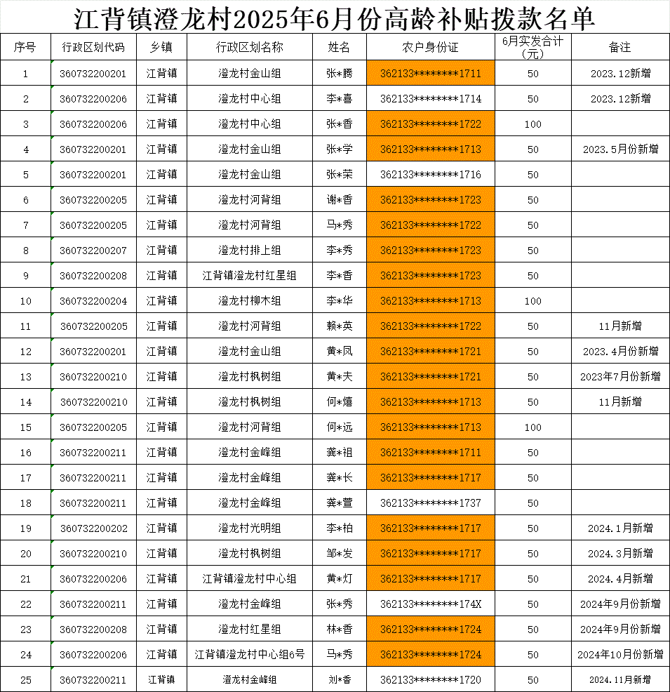 【養(yǎng)老服務(wù)】江背鎮(zhèn)澄龍村2025年6月份高齡補(bǔ)貼撥款名單