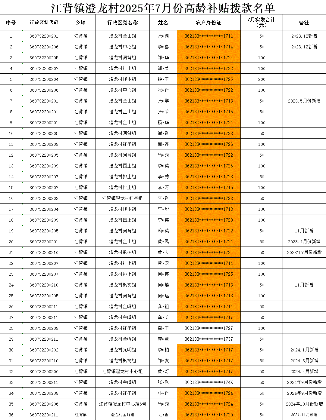 【養(yǎng)老服務(wù)】江背鎮(zhèn)澄龍村2025年7月份高齡補(bǔ)貼撥款名單