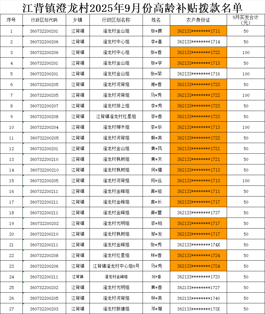 【養(yǎng)老服務】江背鎮(zhèn)澄龍村2025年9月份高齡補貼撥款名單