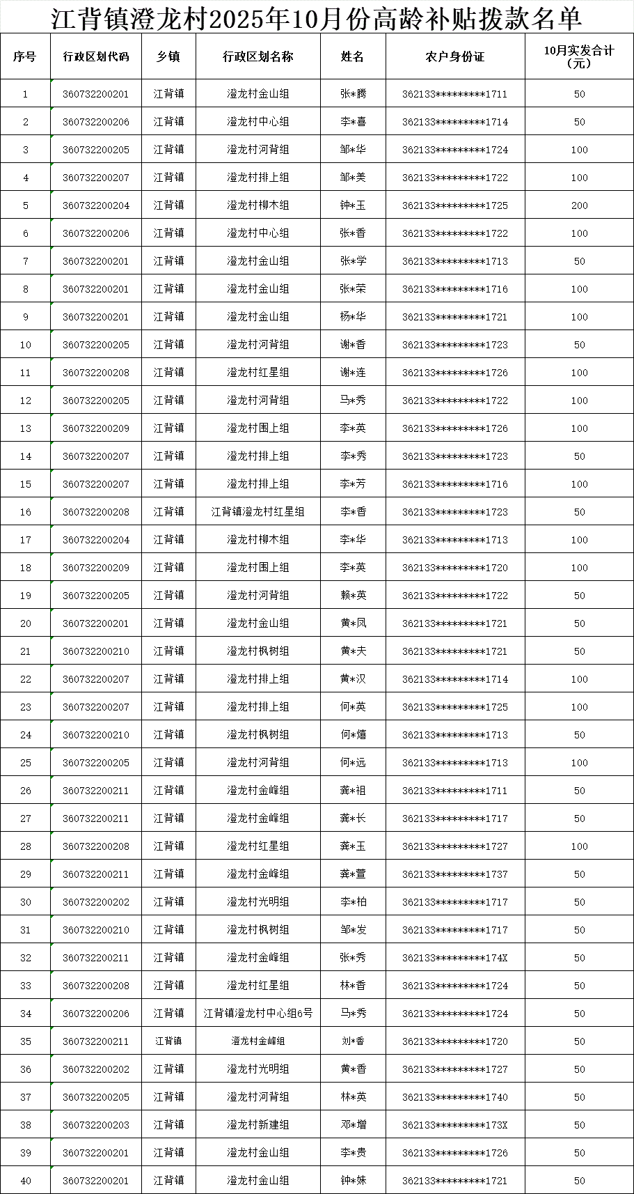 【養老服務】江背鎮澄龍村2025年10月份高齡補貼撥款名單