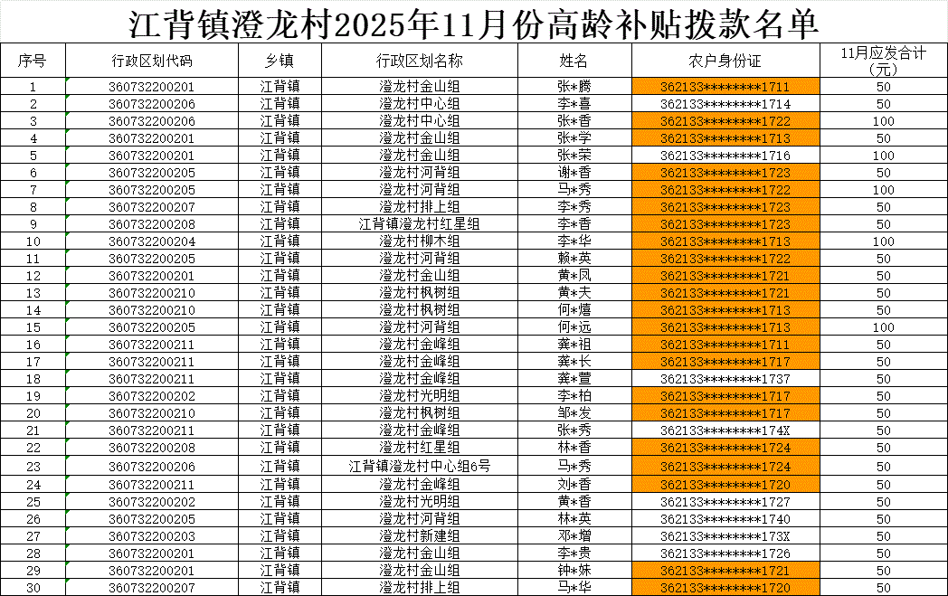 【養(yǎng)老服務(wù)】江背鎮(zhèn)澄龍村2025年11月份高齡補(bǔ)貼撥款名單