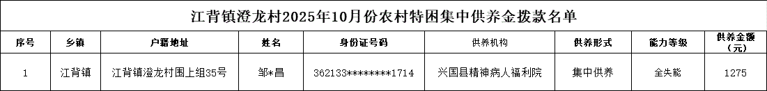 【社會救助】江背鎮澄龍村2025年10月份農村特困集中供養金撥款名單
