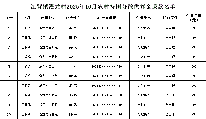 【社會救助】江背鎮澄龍村2025年10月農村特困分散供養金撥款名單