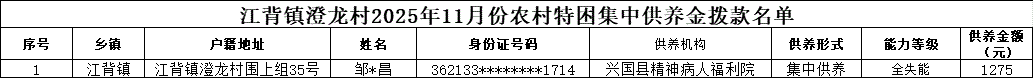 【社會救助】江背鎮澄龍村2025年11月份農村特困集中供養金撥款名單