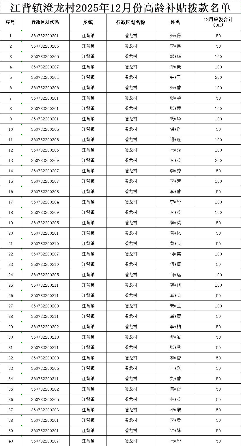 【養老服務】江背鎮澄龍村2025年12月份高齡補貼撥款名單