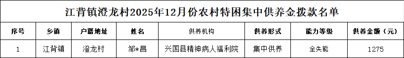 【社會救助】江背鎮澄龍村2025年12月份農村特困集中供養金撥款名單