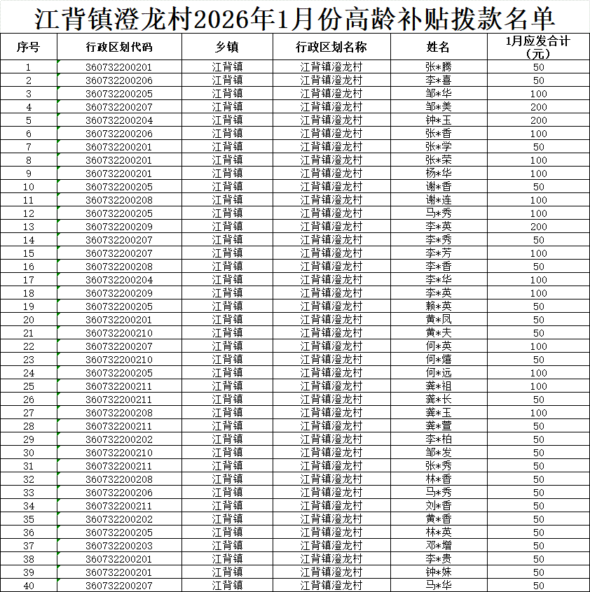 【養老服務】江背鎮澄龍村2026年1月份高齡補貼撥款名單