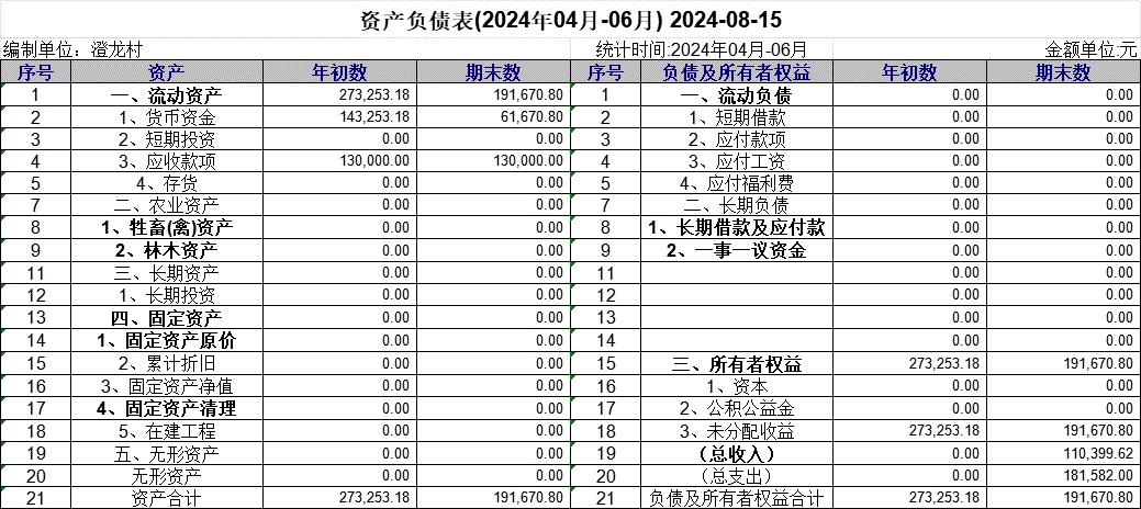 【財(cái)務(wù)收支】澄龍村2024年第二季度資產(chǎn)負(fù)債表公示
