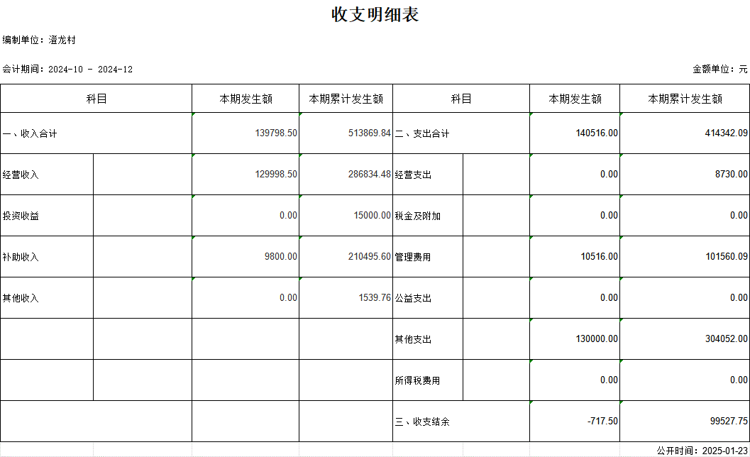 【財務收支】澄龍村2024年第四季度收支明細表公示