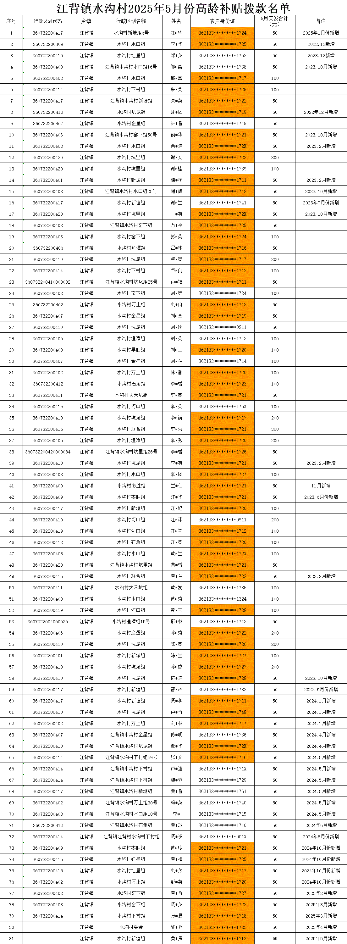 【養老服務】江背鎮水溝村2025年5月份高齡補貼撥款名單