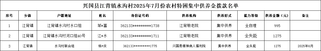 【社會救助】興國縣江背鎮(zhèn)水溝村2025年7月份農(nóng)村特困集中供養(yǎng)金撥款名單