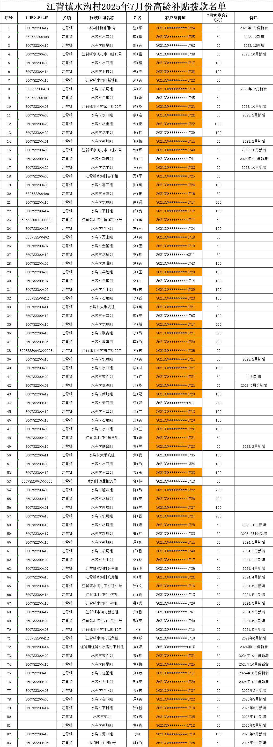 【養老服務】江背鎮水溝村2025年7月份高齡補貼撥款名單
