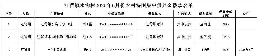 【社會救助】江背鎮水溝村2025年6月份農村特困集中供養金撥款名單