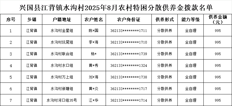【社會救助】江背鎮水溝村2025年8月農村特困分散供養金撥款名單