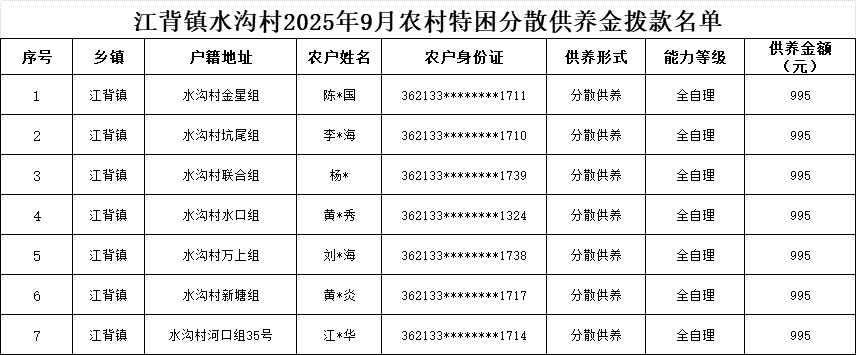 【社會救助】江背鎮水溝村2025年9月農村特困分散供養金撥款名單