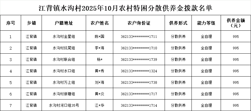 【社會救助】江背鎮水溝村2025年10月農村特困分散供養金撥款名單