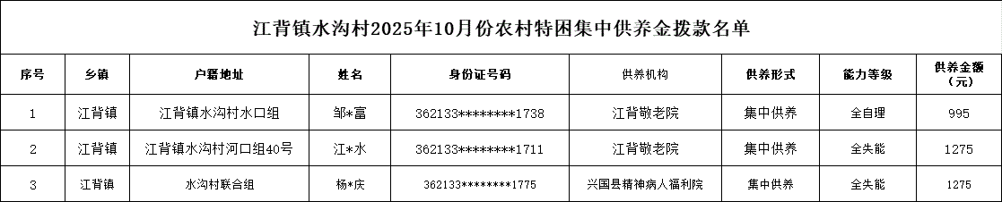 【社會(huì)救助】江背鎮(zhèn)水溝村2025年10月份農(nóng)村特困集中供養(yǎng)金撥款名單